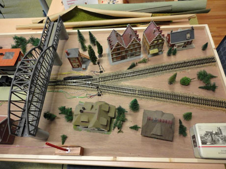 Daarna volgde de verdere aankleding met een stationsgebouw, een brug over het spoor (ook een vereiste), wat huisjes, bomen en een groene grasmat. Voor het opbergen van het rollend materieel werd op één hoek een trommeltje bevestigd. Toen ik achteraf het animatiefilmpje op youtube (zie de link hierboven) bekeek en vergeleek met mijn uitwerking, bleek ons werk griezelig veel te lijken op wat daarin wordt getoond.