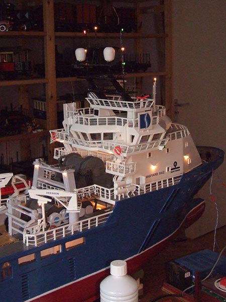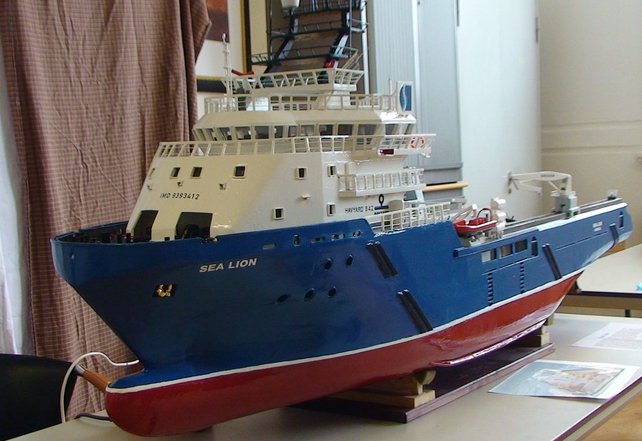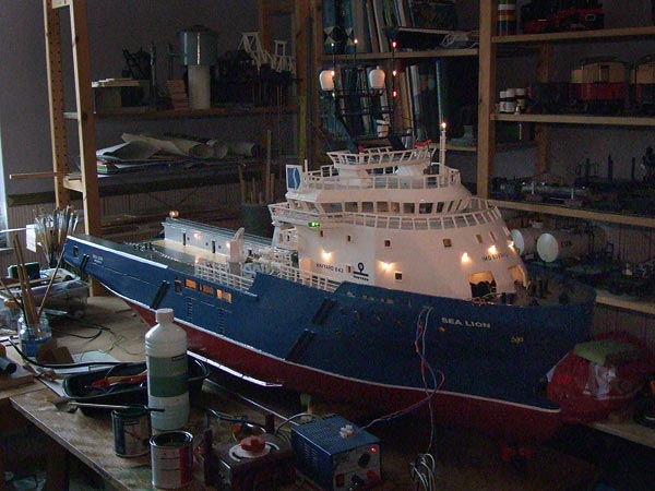 Een van de scheepsmodellen die tijdens de open dagen te zien was, was de Sea Lion van Rinus Verschuren. De Sea Lion blijft voorlopig op de werktafel. Rondom wordt verlichting aangebracht. Zoals op de foto’s is te zien zitten de bakboord- en stuurboordkleuren dubbel, nu ook in de mast. Alleen een blauwe lamp naast het toplicht moet nog worden aangebracht. Zeer recent zijn ook de motortjes ingebouwd voor de radarscanners.