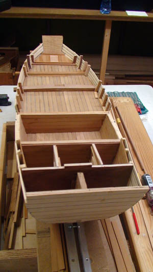 Het best bruikbaar bleek het aanbrengen van strookjes zwart karton tussen de gangen en dekplanken. Dit geeft een strak resultaat, en er kan zonder problemen worden geschuurd en gelakt. Na het aanbrengen van de huidgangen tot aan dekhoogte zijn de triplex dekken gelegd met stroken fijndradig hout, afkomstig van een orgelbouwer. Ook zijn de verblijven voor bemanning beplankt en is het kooibeschot geplaatst. Daarna volgden de in de breedte uitstekende balken op het dek. De breedste hiervan dient ook als vissingbalk voor de grootte mast. Deze balken hebben niet alleen de zijdelingse stijfheid als doel, maar hieraan wordt straks ook een berghoutgang aan gebracht, die geheel vrij van de romp is.