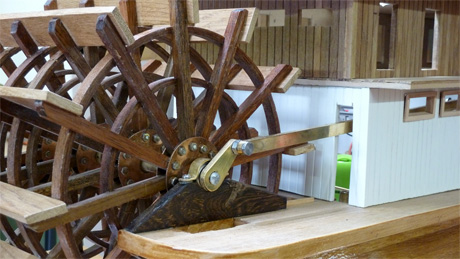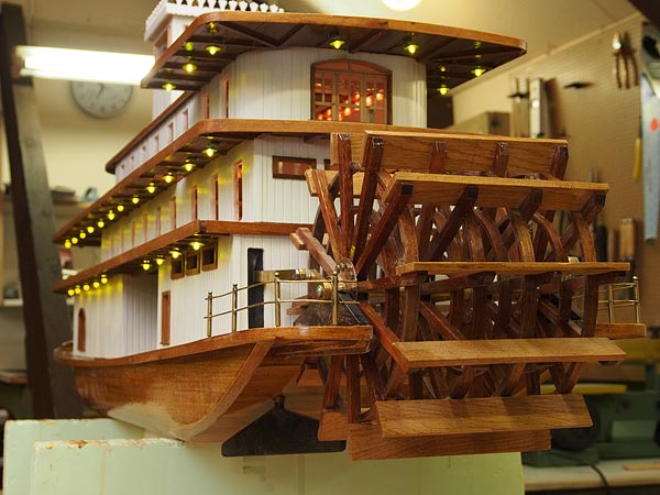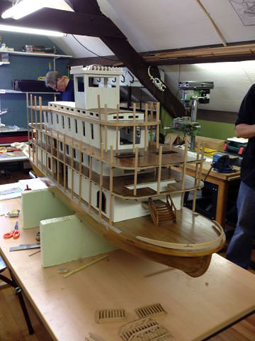 Op de foto's lijkt het alsof deze raderboot al bijna gereed is, echter voor de modelbouwer begint nu pas het fijne werk. De afwerking van de boot met alle accessoires zoals trappen, relingen, tuigage, verlichting en elektronica moet nog beginnen. Alle compartimenten en opbouw zijn gereed. Door Cor Keller zijn de wanden geschilderd en de dekken in de waterdichte lak gezet. En kortgeleden is een nieuwe jonge botenbouwer bij het team gekomen: Stan Vermeulen, een meubelmaker in opleiding. Als dat geen welkome uitbreiding is op het juiste moment!